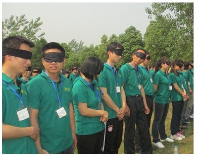 盲人摸号项目就是在完全丢弃视觉和听觉的封闭状况下完成的一个挑战。拓展老师要求我们蒙上眼罩,不能发声,然后发给每人一个数字,再打乱我们的站位,要在最短的时间内根据数字的大小顺序排列站好。对于正常人来说再简单不过的事,但是在这种眼、耳无用的状况下显得尤其困难。