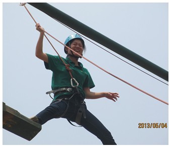 看到这位同事轻松的完成了,大家都跃跃欲试。印象最深的是一位女同事,在爬梯之前充满了期待和止不住的兴奋,当站在断桥上时便开始害怕了,后悔了,向下面的战友们大声呐喊:“我好怕”、“放我下去吧”!教练不断的鼓励和加油:“跨过去你就成功了”。但是这位女同事几近苦苦哀求:“不行,放我下去吧,我跳不过去……”此时,同事们都大声喊道“加油,你行的!再往前一点就能跨过去了。”“加油,相信自己!”就是这样的鼓励,就是这种抱团的力量,这位女同事最终大胆地跨出了这一步,成功了!大家报以热烈的掌声。下来后,这位女同事哭了,应该是既后怕又喜悦吧。跨出一小步,成功一大步。我相信经过这个项目她完全战胜了自我,突破了自我。