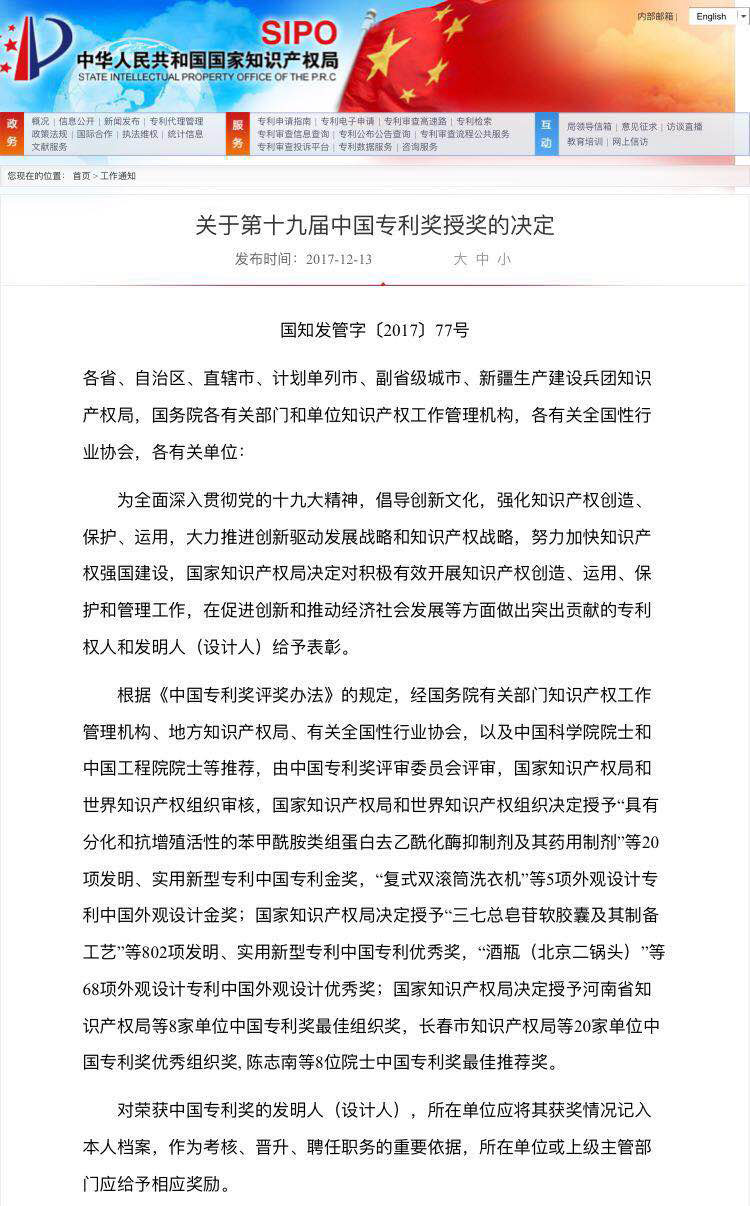 荣获第十九届中国发明专利优秀奖,是孝感历史上专利荣获的最高奖项。
