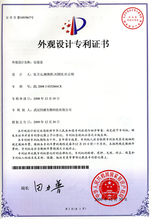 外观设计专利证书(盒专利)